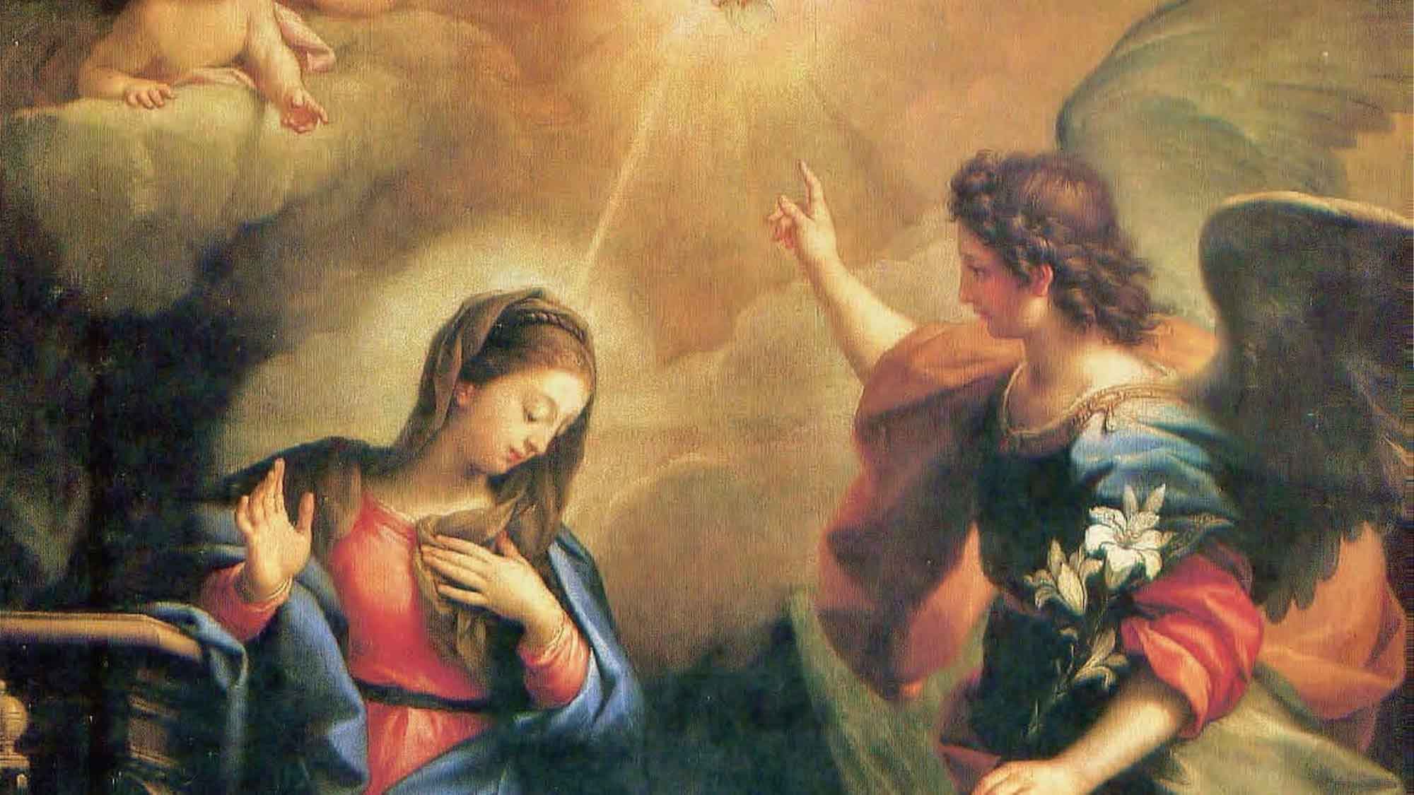 At that time: And in the sixth month, the angel Gabriel was sent from God into a city of Galilee, called Nazareth, To a virgin espoused to a man whose name was Joseph, of the house of David: and the virgin’s name was Mary. And the angel being come in, said unto her: Hail, full of grace, the Lord is with thee: blessed art thou among women. Who having heard, was troubled at his saying and thought with herself what manner of salutation this should be. And the angel said to her: Fear not, Mary, for thou hast found grace with God. Behold thou shalt conceive in thy womb and shalt bring forth a son: and thou shalt call his name Jesus. He shall be great and shall be called the Son of the Most High. And the Lord God shall give unto Him the throne of David His father: and He shall reign in the house of Jacob for ever. And of His kingdom there shall be no end. And Mary said to the angel: How shall this be done, because I know not man? And the angel answering, said to her: The Holy Ghost shall come upon thee and the power of the Most High shall overshadow thee. And therefore also the Holy which shall be born of thee shall be called the Son of God. And behold thy cousin Elizabeth, she also hath conceived a son in her old age: and this is the sixth month with her that is called barren. Because no word shall be impossible with God. And Mary said: Behold the handmaid of the Lord: be it done to me according to thy word