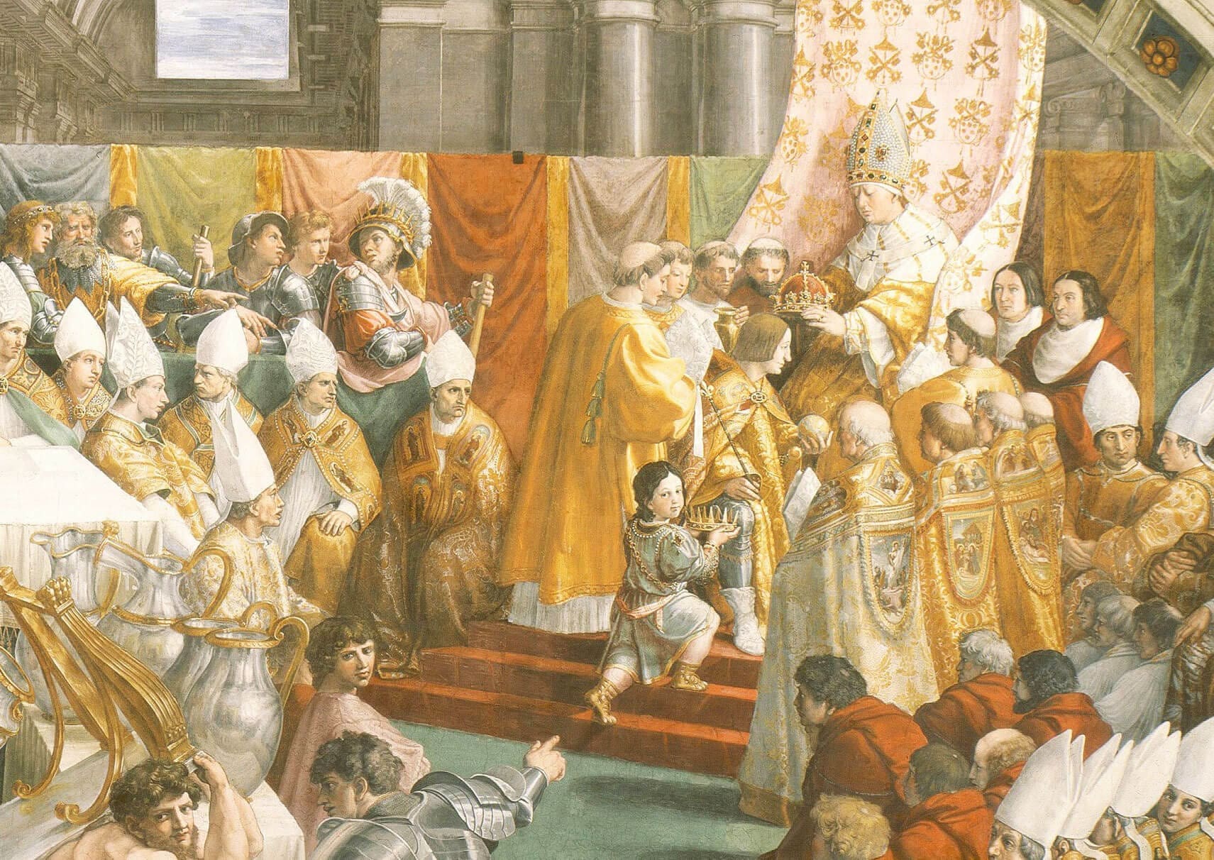 Leo was born in Rome in the eighth century. He was a cardinal and papal treasurer under Pope Adrian I, and was elected pope himself on the very day his predecessor was buried, in the year of Our Lord 795. Leo immediately placed the papacy under the protection of Bl. Charlemagne, King of the Franks, who was deeply honored and responded by sending great treasures and war spoils to benefit the Church and the poor in Rome. A few years into his reign, Leo was attacked by Pope Adrian’s relatives, who scarred his face, gouged his eyes, and nearly ripped out his tongue; but the holy pontiff miraculously recovered the use of his eyes and tongue, and fled to the protection of Charlemagne in Germany. Charlemagne restored order in Rome, and by Leo’s request the pope’s enemies were exiled, rather than executed. At Christmas Day Mass in St. Peter’s Basilica, in the year of Our Lord 800, Leo crowned Charlemagne as Emperor of the Romans, reviving the Western Roman Empire with the first and foremost duty of protecting the Church and all Christendom from the enemies of God. Leo died in the year of Our Lord 816, having nobly led the Church for two decades.