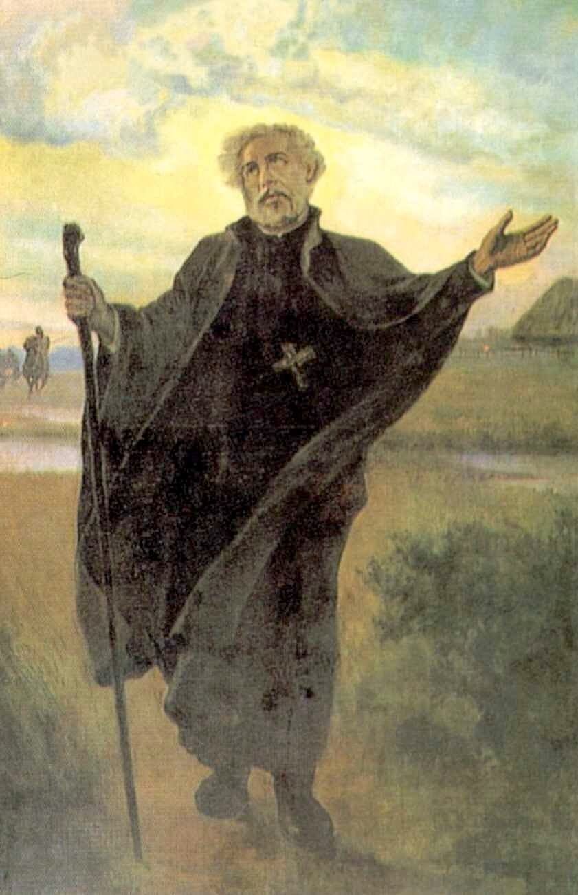 Andrew was born to a noble Polish family in the year of Our Lord 1591. At age twenty he joined the Jesuits in Wilno, in the Grand Duchy of Lithuania, part of the Polish-Lithuanian Commonwealth. After serving as a parish priest and a Jesuit superior, he became a missionary to the large Eastern schismatic population in Lithuania. For twenty years he preached along the roadsides, bringing entire villages back into union and becoming known as “the Apostle of Lithuania” and “the Hunter of Souls”. In 1648 the Cossacks violently rebelled against the Commonwealth under the leadership of Bohdan Chmielnicki, with the aid of Muslim Tartars. On May 16th, 1657, Andrew was captured in a Cossack raid on the city of Pinsk, just after he finished saying Mass, and he was dragged behind horses to the village of Janów. There Andrew was burned, choked, partially flayed alive, and had priestly symbols mockingly carved into his flesh. When he continued to pray aloud for his torturers, his tongue was cut out. Finally, he was beheaded with a saber. His grave was lost when the Jesuits were forced to abandon Pinsk, but he miraculously appeared to lead them back to it years later.
