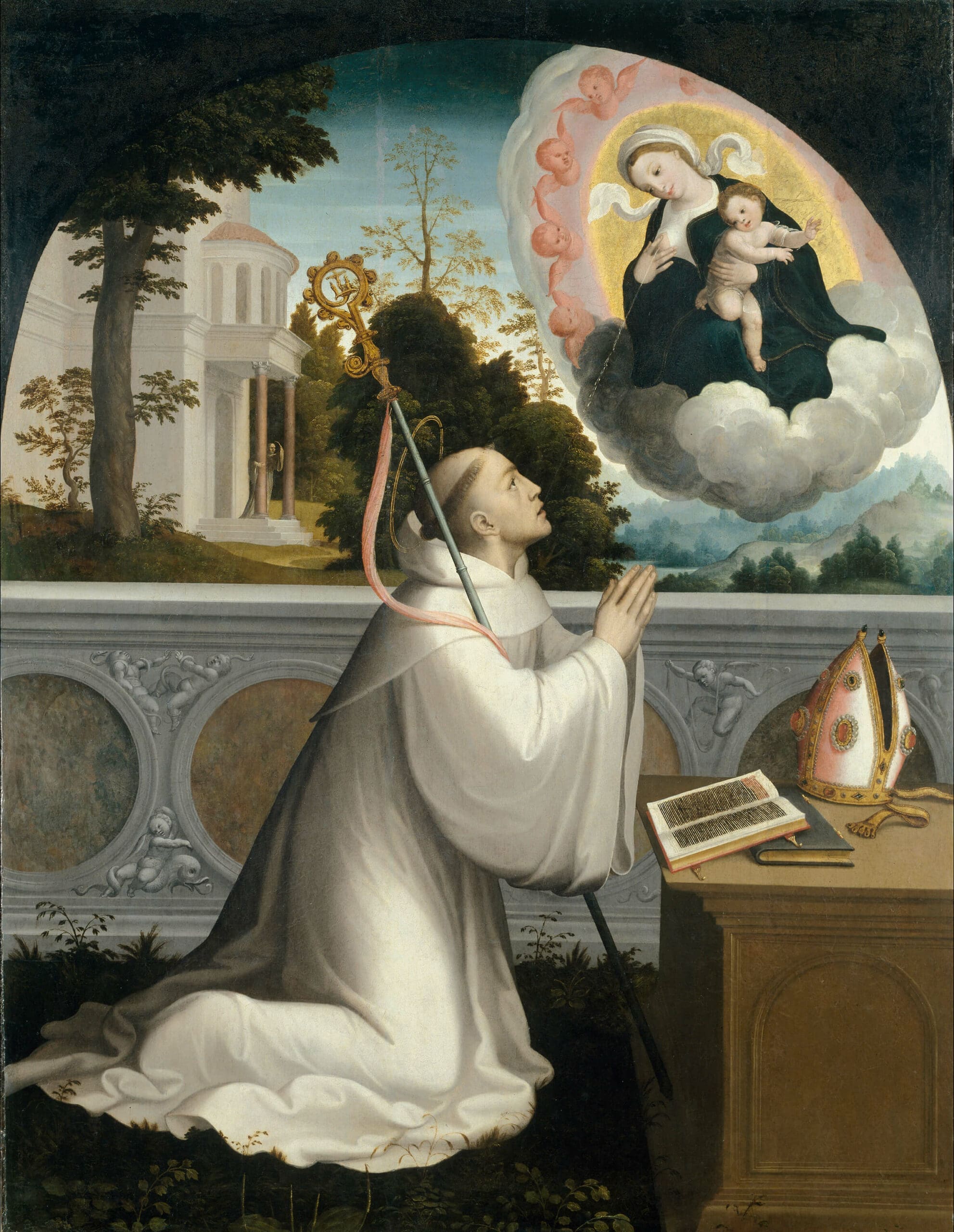 Bernard was born to a French noble family around the year of Our Lord 1090. He was so devoted to chastity that he once threw himself into an icy pond to avoid temptation. Alongside thirty fellow noblemen, Bernard entered the Benedictine monastery at Citeaux under the abbot St. Stephen Harding. A few years later Bernard was sent to begin a new monastery, which he named Clairvaux. Though the rule Abbot Benedict and his monks followed was so strict that his superiors had to order a slight relaxation, Clairvaux soon attracted many vocations. Bernard’s brothers and widowed father all eventually joined him, and even his sister Bl. Humbeline gained her husband’s permission to retire to a Benedictine convent. Bernard was constantly called upon for counsel, and was even chosen to judge between two rival claimants to the papacy. Several times he refused to be made a bishop. When not involved in politics, preaching crusades, or working miracles, Bernard was a prodigious writer of theology, philosophy, and hymns. He died in the year of Our Lord 1153, and is known as “the Last of the Fathers” and as “the Mellifluous Doctor” for the honey-like sweetness of his writings, especially regarding Our Lady.
