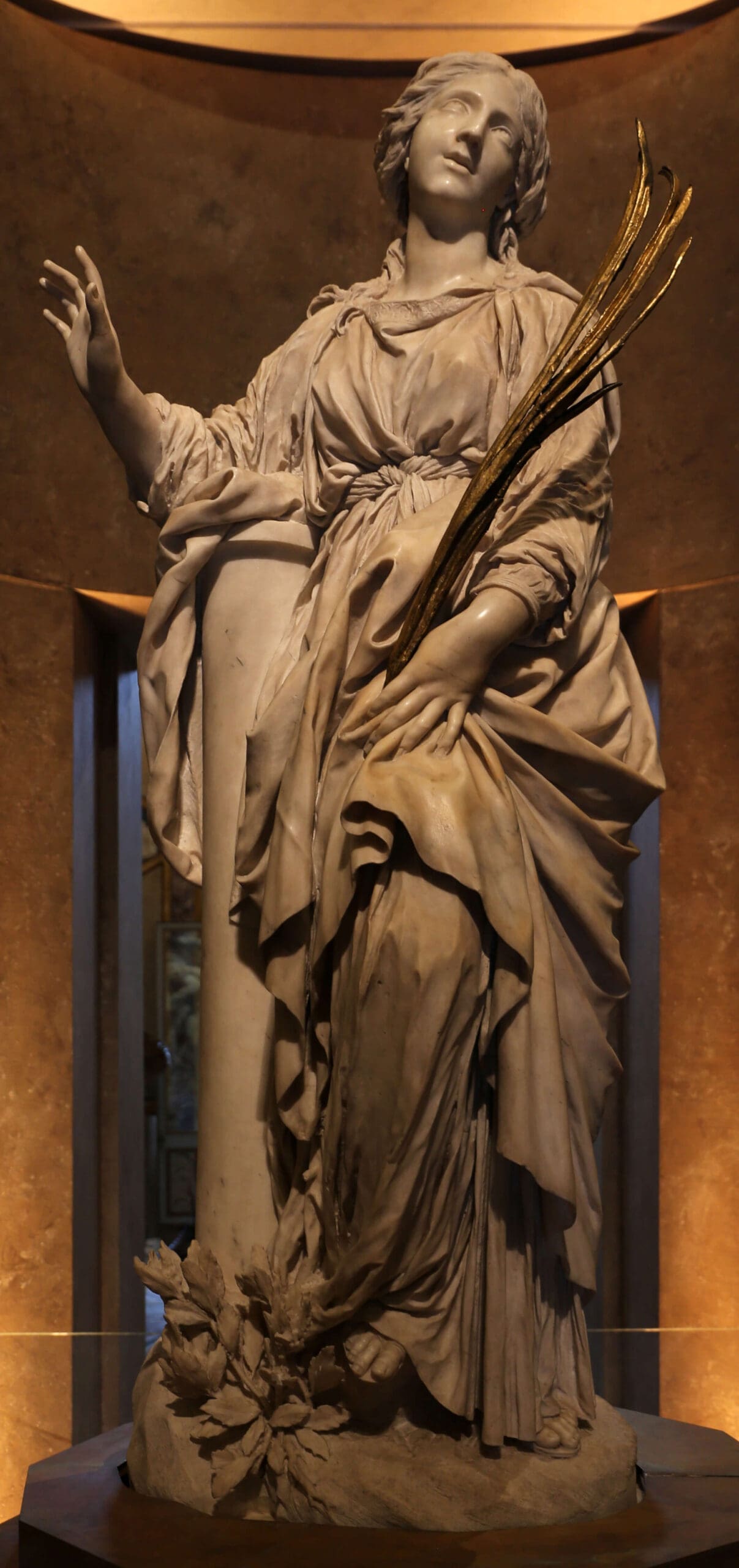 Little is known for certain of Bibiana, other than her existence as a martyr, but most traditional accounts relate that she was the daughter of a Christian Roman noble and his wife, who were eventually betrayed to the authorities during a persecution in the fourth century. Bibiana’s father was exiled and eventually martyred, while her mother was executed just outside Rome. Bibiana and her sister Demetria were deprived of all their belongings, but otherwise spared, since a Roman official hoped to sway them away from the faith. The two sisters persevered, however, and were summoned before the official. Demetria was struck dead immediately after confessing her Christian faith, but Bibiana was forced to endure many temptations, which she withstood bravely, preserving her chastity and defying the pagan allurements. Finally, the angry official ordered that she be scourged to death, a violent fate which Bibiana endured with heroic virtue. After she died, her body was left to be devoured by wild animals, but it was soon discovered and eventually laid to rest with those of her sister and mother in a church dedicated to the virgin martyr.