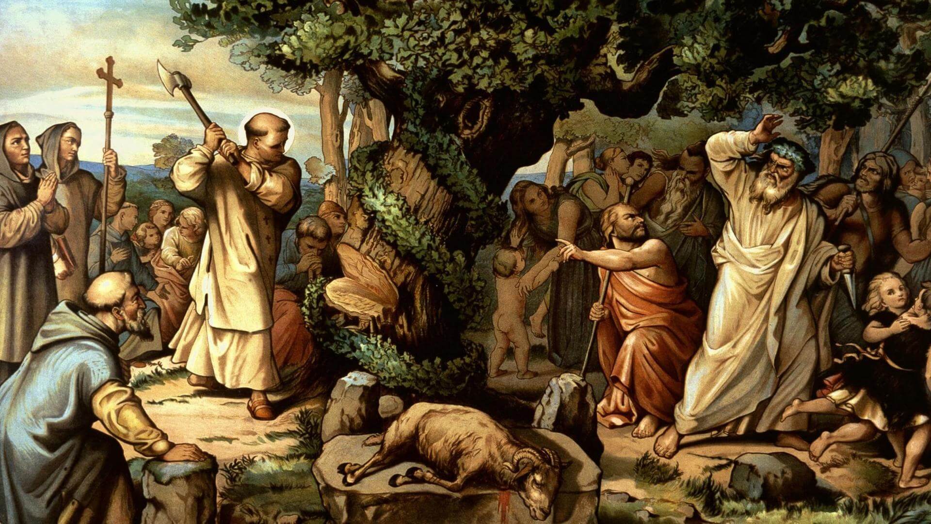 Boniface was born with the name Winfrid in the late seventh century, in what is now Devonshire, England. As a Benedictine monk he attempted to preach in Frisia, but was forced to return to England. A few years later, Pope St. Gregory II sent Boniface to evangelize the German tribes beyond the Rhine. After several years of hard work he was made a bishop, and later appointed an archbishop by Pope St. Gregory III. On one occasion, Boniface encountered Norse pagans in Germany who were worshiping a huge oak tree. Boniface swiftly took up an axe and hewed down the tree, using the timber to build a chapel in honor of St. Peter. The act inspired many conversions, and some consider this story to be the origin of the traditional Christmas tree. The mission in Germany was difficult but successful, resulting in many conversions, reforms, and the first German synod. With the cooperation of the Carolingians, Pope St. Zachary made Boniface Archbishop of Mainz and Primate of Germany; he eventually resigned this office in order to again evangelize in Frisia. After some early success, Boniface and several companions were murdered by Frisian pagans, in the year of Our Lord 754. Boniface is venerated as the Apostle of Germany, as well as a patron of brewers and tailors.
