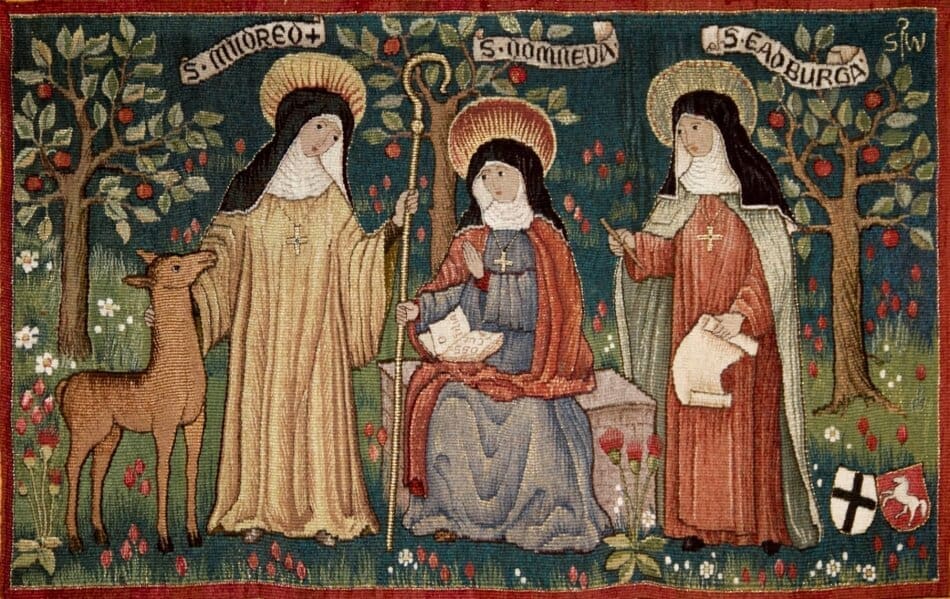 Mildred, or Mildrith, was born in the mid-seventh century to a minor Anglo-Saxon king and his holy wife, known as either Domneva or Ermenburga. Their family tree boasts many other saints, beginning with King St. Ethelbert of Kent and his queen St. Bertha. Mildred and her sisters, St. Milburga of Much Wenlock and St. Mildgyth, all pursed the religious life. Their mother had been granted as much land as her tame deer could circuit in a day, as the weregild or recompense for the murder of her brothers, after King Egbert of Kent had repented of encouraging the crime. The queen used this land to create a monastery called Minster Abbey, and after Mildred had taken the Benedictine habit in France, she was made the first abbess of Minster. Mildred died near the end of the seventh century, and many miracles are attributed to her relics. She is often portrayed with a deer, or hind, which remains the symbol of Minster-in-Thanet, and though the original nuns were eventually driven out by Vikings and the monastery suppressed under Henry VIII, Benedictine nuns from Bavaria reestablished the abbey in the twentieth century and reside there to this day, with a relic of St. Mildred.
